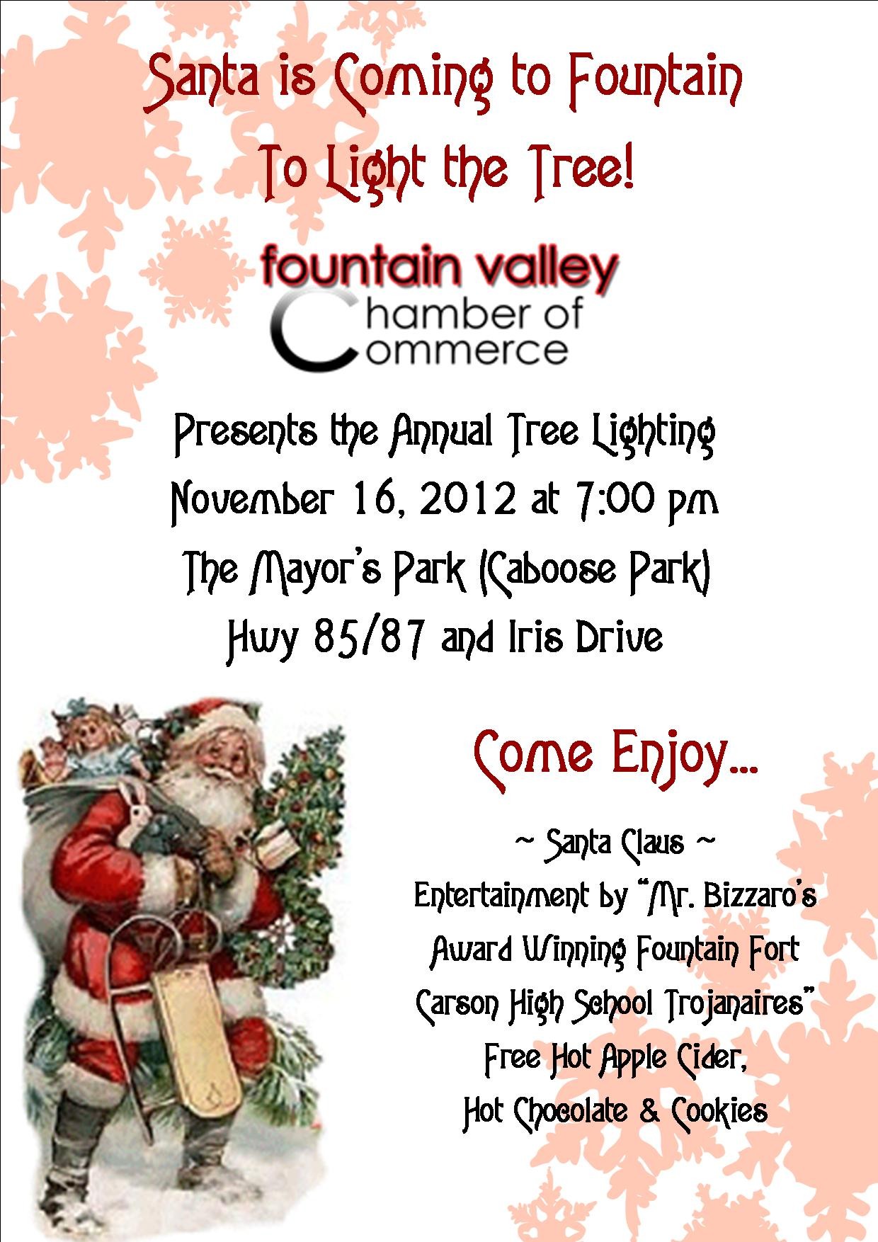 Fountain Valley Chamber of Commerce invites you to the Free Annual Tree Lighting Ceremony to be held on Friday, November 16, 2012 at 7PM at Mayor’s Park. There will be a special guest from the North Pole (Santa Claus).