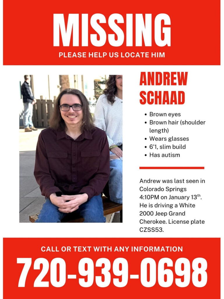 Andrew Schadd was last seen on January 13th at 4:1 0 pm. He has brown eyes, brown hair, wears glasses and has autism. He was driving a White 2000 Jeep Grand Cherokee.